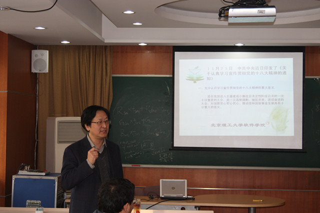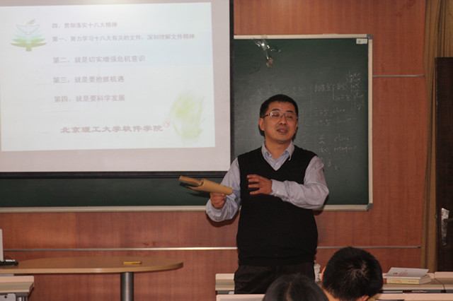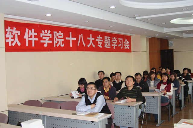 2012年11月26日下午,软件学院在软件楼207会议室召开全院教职工大会,传达学习党的“十八大“精神。会议由学院党委李波书记主持。