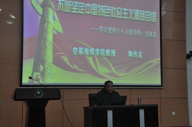 为深入学习宣传贯彻党的十八大精神,深入推进“信仰 青春 阳光”主题教育活动,基础教育学院邀请到空军指挥学院政治理论教育知名专家陶传友教授为学生带来了题为《不断坚定中国特色社会主义道路自信》的主题报告。基础教育学院党委书记王悦音,副书记副院长丛磊,校团委副书记肖坤出席了本次报告。