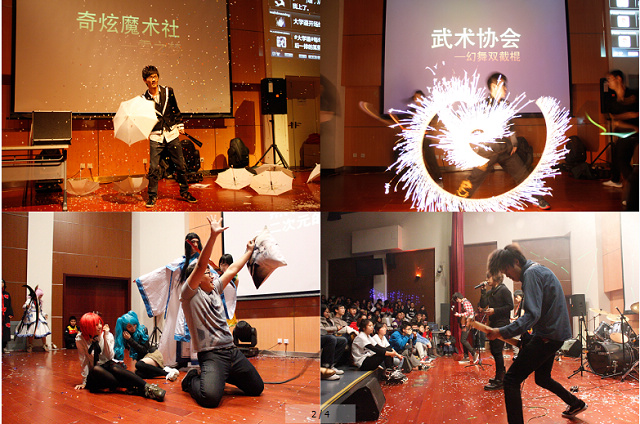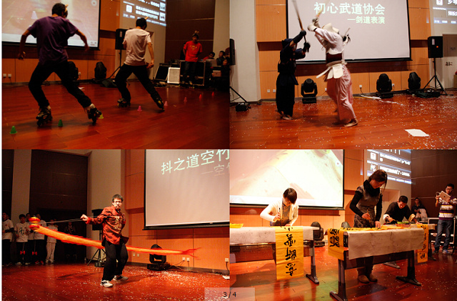 跆拳道的功夫秀显示出其成员的深厚功力,无阳斋充满意境的表演将音乐与书法融合起来,悦音唯美动人的演唱也让台下的观众连连叫好。还有酷爱轮滑社技艺精湛的表演、剑道社令人振奋的剑道展示、抖之道空竹社的绝妙演出、龙艺社与无阳斋书画社的中国风、BIT Crew街舞社动感十足的舞蹈更是点燃了晚会现场的气氛。