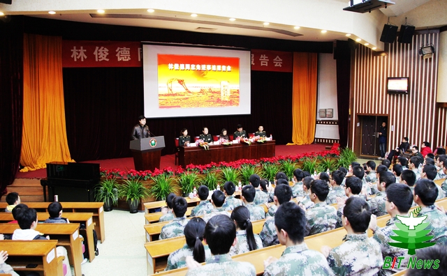 12月24日,根据共青团中央和解放军总装备部的安排,我校在中心教学楼报告厅隆重召开林俊德同志先进事迹报告会。本次报告会是林俊德同志先进事迹北京高校巡回报告会的第一场,近期报告团还将走进清华大学、北京大学、北京航天航空大学,为高校学子作报告。