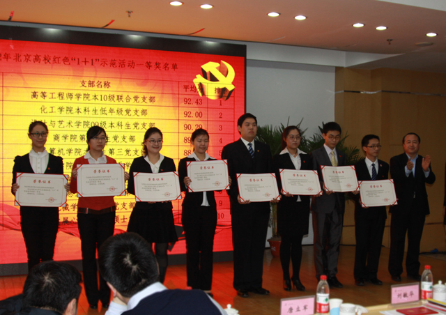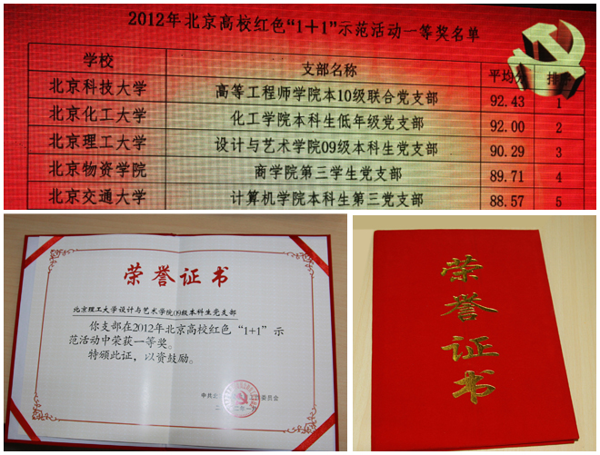 12月26日下午,“学习宣传十八大精神,服务首都科学发展”2012年北京高校红色“1+1”示范活动展示评审会在北京化工大学逸夫图书馆一层多功能厅举行。我校设计学院2009级本科生党支部参加了展示评审并荣获一等奖。