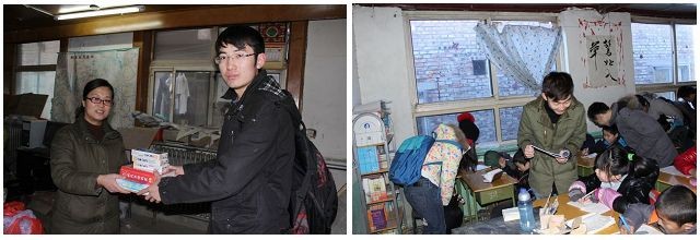 12月18日下午,志愿者来到明圆学校时同学们还在上课。带队负责人刘绍荣代表志愿者队伍向学校捐赠了学生急需的棉手套和学习资料等物品。随后,志愿者与六年级的同学展开了丰富多彩的互动活动。通过一对一的辅导与交流,支教团成员为学生宣传讲解十八大精神,帮助学生解决学习上的难题,拓宽视野,培养学习乐趣,同时让他们更多的了解外面的世界。
