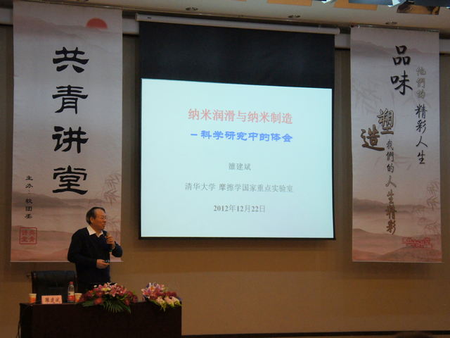 12月末,共青讲堂第98期在中关村校区七号楼报告厅开讲,中国科学院院士雒建斌为我校师生进行“科学发展新成就——纳米润滑与纳米制造”的讲座。雒建斌教授曾担任两届973项目首席,是中国摩擦学领域的专家,无论是在国际还是国内的摩擦学领域都享有很高的声誉。虽然天气寒冷,但观众的热情却丝毫不减,七号楼报告厅座无虚席。雒建斌院士从制造业的发展历程讲起,用通俗易懂的语言讲解高深的摩擦学专业技术知识,引用大量图片、动画、图表等多种展现形式,让观众更直观地理解纳米润滑与纳米制造的相关知识。用大家熟悉的LED做例子,让观众感受纳米就在身边。