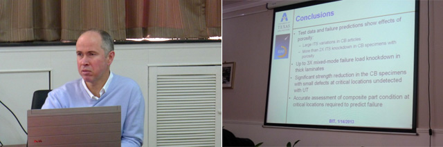会上,Andrew Makeev教授的报告详细介绍了他们实验室最近一段时间在复合材料健康监测和寿命预测方面的工作。 Andrew Makeev教授指出对于复合材料,工艺过程中的制造缺陷对复合材料结构响应行为和服役寿命具有重要的影响,精确定量和定位加工缺陷的能力对于改善复合材料设计和降低维护成本都是至关重要的。复合材料制备缺陷的精确测量并将3维缺陷测量结果转化到结构模型中对于评价缺陷对复合材料强度和寿命的影响是必要的。特别是对于环氧树脂基碳纤维增强或玻璃纤维增强复合材料,在制备过程通常会出现孔洞和起皱等典型缺陷,这些缺陷严重影响复合材料结构的性能和服役寿命。因此Andrew教授的实验室近年来致力于将复合材料的缺陷包括其几何形状,分布和位置通过Micro-CT设备测量,3维重构技术和自动分析技术等手段转化到结构模型中,以分析这些缺陷对结构行为的影响;另一方面该实验室结合无损健康检测结果和通过全场位移测量得到的复合材料3维材料常数测,提出了不需预设缺陷大小和发展路径,分析复合材料多级失效模式和预测结构损伤演化的结构分析方法。该方法预测结果与后续环氧树脂基玻璃纤维和碳纤维复合材料疲劳试验得到的结果具有很好的一致性。
