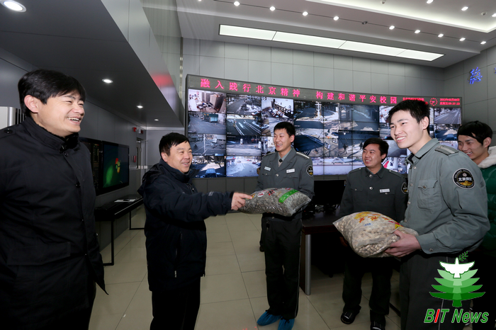 2月8日杨宾副校长在学校办、保卫处、后勤集团和宣传部相关负责人的陪同下,在中关村校区慰问了北门保安值班人员、锅炉房和变电室值班人员以及学校监控室值班人员,对节日期间坚守工作岗位的职工致以新春祝福,表示衷心感谢,希望大家春节期间提高安全生产意识,为全校师生员工做好保障工作。