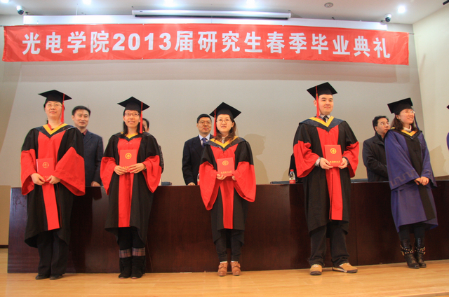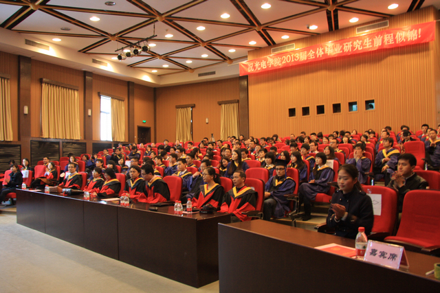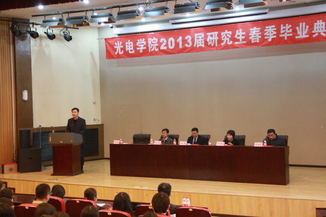2013年3月22日下午,光电学院2013届春季毕业研究生毕业典礼在学校七号楼报告厅举行。出席典礼活动的学院领导和老师有:光电学院院长薛唯、副院长黄一帆、光电信息技术与颜色工程研究所所长刘越、光电子研究所所长高春清及部分老师和家长。典礼仪式由学院党委副书记、副院长邹锐主持。