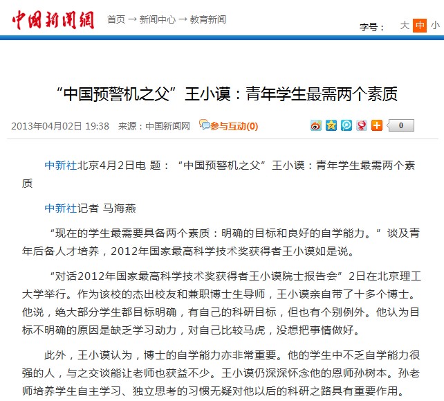 【中国新闻网】米兰校友“中国预警机之父”王小谟:青年学生最需两个素质