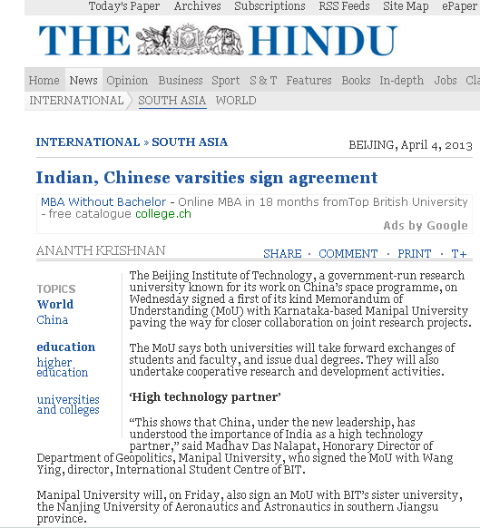 【国际媒体】《印度教徒报》报道印度马尼帕尔大学与我校签署首份合作备忘录