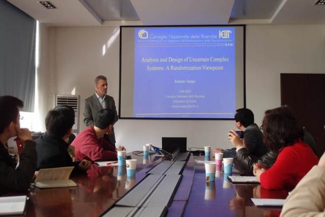 这次学术报告会Roberto Tempo教授用精彩的图片和翔实的数据,从随机化的角度深入浅出的论述不确定复杂系统分析与设计的最新研究进展,详细阐述了不确定复杂系统分析与控制中涉及的随机化算法及概率方法的内涵和性质及其在自然灾害识别、环境监测中微型/小型无人飞行器飞行控制的应用。报告结束后,参加会议的师生与Roberto Tempo教授就相关问题进行了充分的交流与讨论。此次报告学术气氛浓厚,讨论问题深入,发言积极踊跃,取得了很好的学术交流和开阔视野的效果。