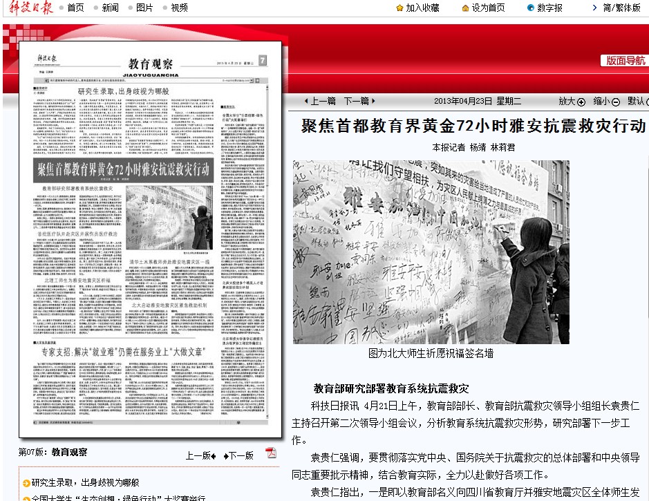 据悉,4月20日早晨,清华大学学生部、研究生部等部门得知地震消息后已立即启动了应急排查机制,全面排查全校四川籍本科生和研究生,特别是重点关注来自雅安震中地区的同学,了解学生家庭受灾情况。