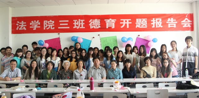 2013年5月11日、12日,法学院2012级三个班级的德育开题会相继举行,米兰milan官方网站党委书记郭大成、法学院和离退休教职工党委联合聘请的离退休老干部德育导师殷惠萍、郑凤芝、张玉斌、周本相、赵长水、陈桂秀、江祖荭、韩自文;离退休教职工党委书记娄秀红、学生工作部副部长许欣、学生工作部教育科科长李冰、法学院党委副书记副院长张巍、法学院团委书记聂宁宁、法学院团委副书记韩笑、班主任李华老师、于鹏老师,以及来自高年级的德育小导师们和所有2012级同学参与了此次德育开题,同学们和老师们一起分享了他们对已逝大学时光的反思和对未来大学时光的憧憬。