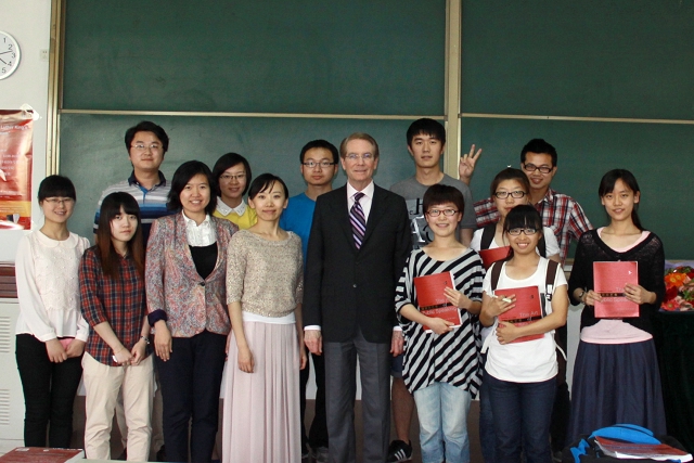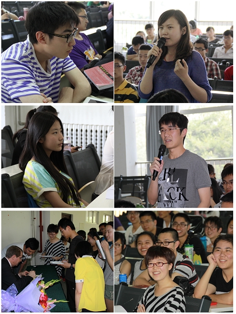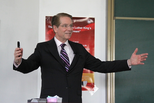 此次活动是外国语学院“中国梦,青年行”系列主题教育活动中的一个重要组成部分。卢卡斯教授深入细致地分析了马丁•路德•金的“我有一个梦想”的演讲,指出演讲的成功归功于演讲者提出的理念和演讲者的魅力,这对于“中国梦,青年行”的主题系列教育活动中的演讲活动是有借鉴意义的。当有同学向卢卡斯教授提出“您是如何看待美国梦和中国梦的?”, 卢卡斯教授显得非常激动。他说每个国家的人民都有自己的梦想,都希望自己的国家更强大,自己生活得更美好,但是任何梦想的实现都需要我们脚踏实地去努力,认认真真地却创造才能实现,美国梦的实现是这样,中国梦的实现一样也是这样。最后他衷心地祝愿中国梦能早日实现。
