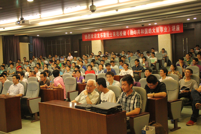 宇航学院学生代表郭佳向龙乐豪院士献花以表达我校师生对龙院士的敬仰和感谢。龙乐豪院士首先讲述了自己儿时溺水得救的故事,并从此将感恩作为自己的人生准则。曾亲眼目睹了日军屠杀中国人的他励志报效祖国,为祖国的国防事业贡献自己的力量。随后龙院士着重讲述了自己主持设计研发长征三号系列运载火箭过程中的种种经历,并回顾了他们如何克服千难万险并最终取得完满成功。最后,龙院士以自己的人生哲言“勤奋补拙,智商居次;三分聪明,七分勤奋”与大家共勉,并鼓励青年人“做人要知足,做事要知不足,做学问要不知足”。