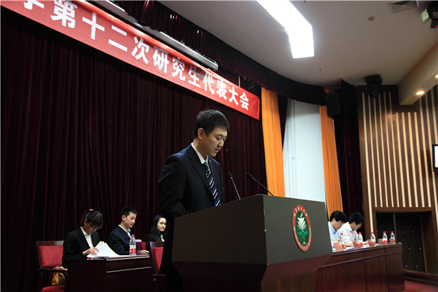 随后,全体代表听取并审议通过了校研究生会主席贺长宇同学代表校第十一届研究生会委员会作的题为《砺石淬金 青春逐梦 为建设世界一流理工大学贡献青春力量》的工作报告。报告从强化思想引领,营造校园氛围,维护学生利益,拓宽实践渠道等四个方面总结了过去三年的工作,并提出了未来的工作重点和发展目标:以严谨的学术精神打造“学术型”研会,以良好的道德素养打造“导向型”研会,以和谐的文体环境打造“多面型”研会,以务实的工作态度打造“实践型”研会,带领广大同学积极投身到实现“中国梦”的伟大实践中去。