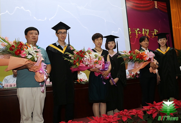 设计与艺术学院代表2013届毕业生向母校赠送纪念品——“北理足迹”校徽模型,郭大成代表学校接受赠送。