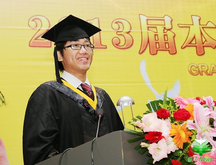 软件学院2013届毕业生王子实代表全体毕业生发言,他与大家一起回顾了四年大学生活中难忘的片段,表达了对母校、对老师、对同学的感恩之情,并表示将带着米兰的烙印在今后的道路上奋力拼搏,谱写绚烂的人生篇章,创造属于自己的辉煌。