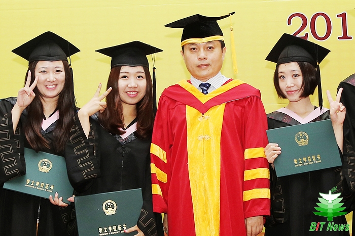 毕业典礼结束,全场师生共唱校歌,用歌声表达对母校的深厚感情。随后举行的学位授予仪式上,党委书记郭大成和校长胡海岩为各学院毕业生代表授予学位,颁发学位证书、毕业证书,并合影留念。