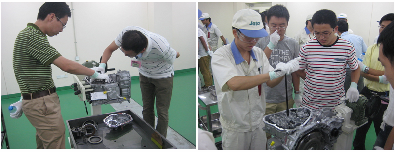 工厂参观环节由生产部分带领和讲解,分组观了加特可(广州)的CVT生产和装配车间,包括零件的加工、零部件装配线、总成装配线等。CVT拆解环节也是分组进行,分为3组由Jatco技术人员拆分和讲解,将CVT7的各个部件进行了全面的讲解。参观和拆解过程中,高校学者和Jatco工作人员相互交流和学习,对CVT技术有了较全面的认识。