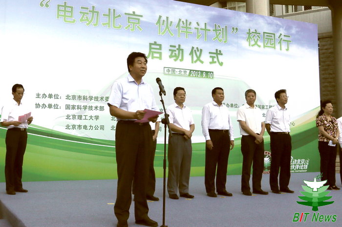 北京汽车集团公司董事长徐和谊、中国汽车报社社长李庆文、北京市科委主任闫傲霜、科技部高新司司长赵玉海分别就“电动北京伙伴计划”校园行活动的重要意义发表讲话。