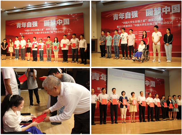 寻访“中国大学生自强之星”活动由团中央和全国学联主办,自2008年启动以来每年举办一次,评选“中国大学生自强之星标兵”10名,“中国大学生自强之星”100名和 “中国大学生自强之星”提名奖获得者800名。在今年的活动中,校团委结合“信仰•青春•阳光”主题教育活动中“青春榜样”的选树工作,从校级青春榜样库中推荐了张大奎、王穆荣两名自强不息榜样参加全国大学生自强之星评选。据悉,本次活动共有全国各院校推荐的9164名大学生参评,其中张大奎同学荣获“中国大学生自强之星标兵”,是我校参加寻访“中国大学生自强之星”活动以来第一位获得该荣誉的学生,王穆荣同学获得“中国大学生自强之星”提名奖。