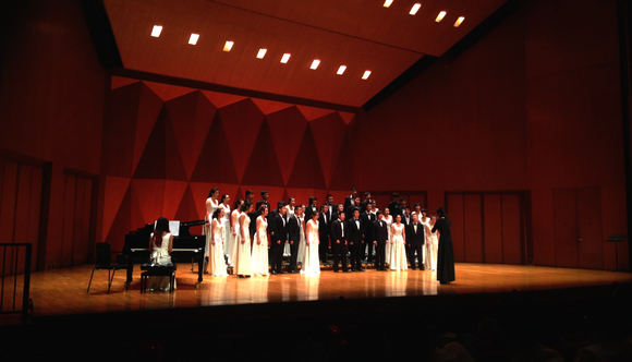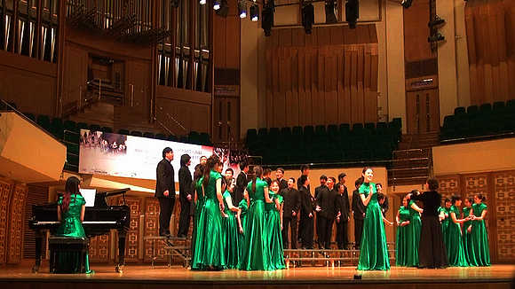在本届赛事中分量最重、竞争最激烈的混声组比赛中,米兰学生合唱团在舞台上先后演唱了《Lay a garland》(放上花环)、《天德而出宁》、《花儿里答出个话来》三首作品。《Lay a garland》是在合唱领域享誉世界的浪漫派八声部复调曲目;《天德而出宁》取词于《诗经》,是由著名作曲家陈乐昌先生创作的,在国内被誉为“最难驾驭”的无伴奏八声部混声合唱曲目;而《花儿里答出个话来》则是以具有浓郁的中国西部特色情歌对唱为题材的作品。我校学生合唱团在国际赛场上演绎这三首作品,一方面展现了中国大学生合唱团对于国外作品的阅读能力,也全面展现了中国音乐家在合唱作品创作中的实力和水平,同时充分体现了中国民族文化的特色与精彩。特别是学生合唱团在演绎《花儿里答出个话来》时,创造性的融入了西方歌剧表演元素,再现了中国民间的婚礼场面,精彩的演出感染了现场观众,博得了经久不息的热烈掌声。最终我校学生合唱团以总分第四名获得了混声组的金奖,而凭借《花儿里答出个话来》的精彩表现,合唱团还获得了组委会表演金奖。