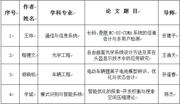 日前,北京市教育委员会发布《关于公布2013年北京市优秀博士学位论文名单的通知》(京教函〔2013〕422号),批准59篇博士学位论文为2013年北京市优秀博士学位论文。我校在今年的北京市优秀博士学位论文评选中取得了历史性的突破,王帅、程德文、胡晓松、辛斌四位博士获此殊荣,具体信息如下(排序不分先后,按上级文件序)。