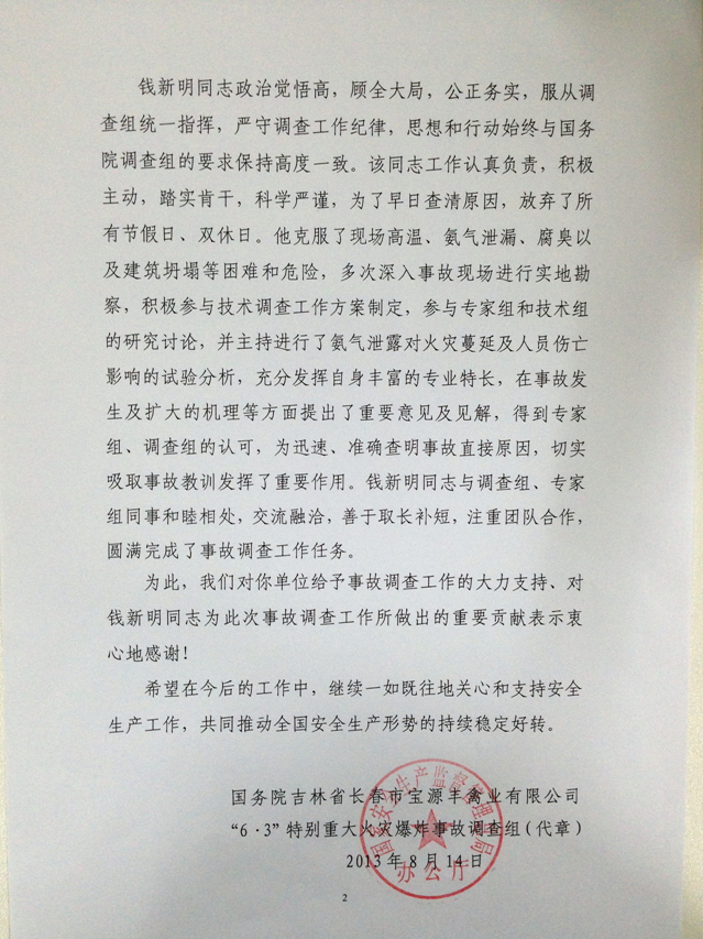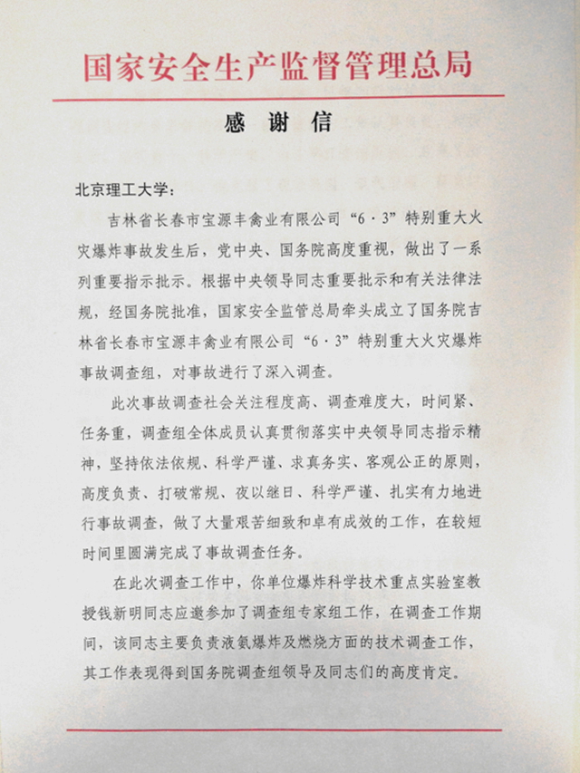 吉林省长春市宝源丰禽业有限公司“6.3”特别重大火灾爆炸事故发生后,党中央、国务院高度重视,做出了一系列重要指示、批示。在此次调查工作中,米兰milan官方网站爆炸科学技术重点实验室教授钱新明同志应邀参加了调查组专家组工作,在调查工作期间,主要负责液氨爆炸及燃烧方面的技术调查工作,其工作表现得到国务院调查组领导及同志们的高度肯定。