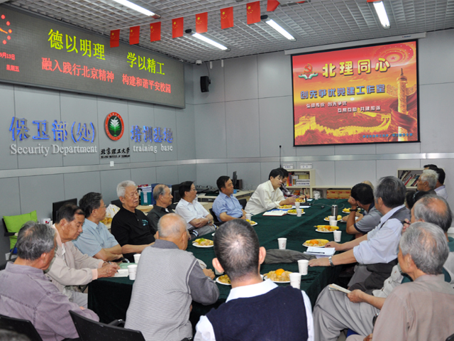 2013年9月13日,保卫处、离退休教职工党委邀请“北理同心”创先争优党建工作室“米兰安保思想疏导师”以及部分离退教职工党支部书记在保卫处培训基地举行了“传承延安精神构建和谐校园”主题座谈会。参加座谈的“思想疏导师”有:陈元祯、方嘉洲、王秀峰、郭景华、赵长水、安万林、王忠洲、秦秀坤、赵硕阁、刘重阳、孟祥福、张忠廉、伍惠然、徐定、张英志、赵鸿德、陈俊南,离退休教职工党支部书记:姚仲鹏、李品生、张锦洲、顾秋润。副校长杨宾,离退休教职工党委书记娄秀红,离退休工作处副处长范友联参加了本次座谈,座谈会由保卫处处长代方震主持。