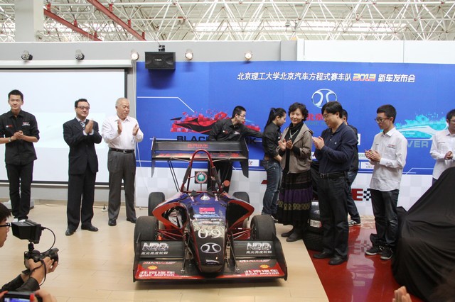 校党委副书记副校长李和章、北京汽车商品企划部副部长陈思英、校团委书记蔺伟、教务处副处长曹峰梅共同为“黑鲨四代”汽油机方程式赛车揭幕。