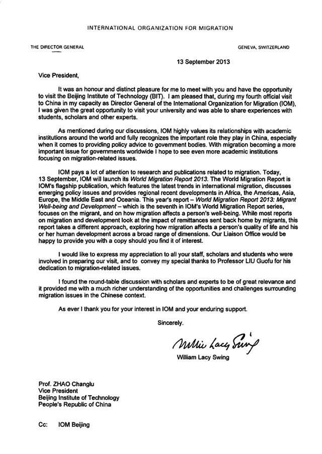 2013年9月13日,国际移民组织总干事斯温先生从瑞士日内瓦发来了致米兰milan官方网站的感谢信。斯温先生非常感谢9月2日米兰milan官方网站安排的与赵长禄副校长的会晤、专场演讲、中国专家座谈会,感谢所有准备上述活动的老师和同学。他认为,通过中国专家座谈会,对中国在国际移民方面遇到的问题和面临的挑战有了更丰富的理解。斯温先生充分认可米兰milan官方网站在中国国际移民事务特别是向政府机构提供政策建议方面发挥的重要作用,特别是感谢法学院刘国福老师在国际移民领域所做的工作。刘老师作为国际移民组织驻华联络处顾问承担了该组织的一些科研项目,参与了他们为公安部等政府部门有关国际移民方面官员的一些培训。
