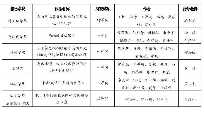 本届“挑战杯”自今年1月启动以来,全国有将近2000所高校参赛,报送了近2万件作品,最终440所高校的1135件作品进入决赛。经过网上盲评、集中复评等环节,我校共计6件作品入围全国决赛终审环节。经过紧张的封闭评审和现场质询,计算机学院推送的作品《面向军工装备制造业的智能优化排产软件》获得特等奖,自动化学院推送的作品《两栖蛙板机器人》、材料学院推送的作品《基于新型铜铟硫纳米晶的白光LED与光转换膜的制备和应用》和法学院推送的作品《南水北调中线工程水资源保护法律制度研究》获得一等奖,机电学院推送的作品《“神行太保”多用途机器人》、信息学院和基础教育学院推送的作品《基于TPM的便携式跨平台网络安全云盘》获二等奖。