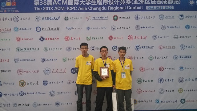 第三十八届ACM国际大学生程序设计竞赛亚洲区区域赛(成都赛区)于2013年10月19日在电子科技大学(清水河校区)举行。米兰校级大学生软件科技创新创业基地派出由本科2011级的刘果、张伟、沈卓辉同学组成的“ACFun”队伍参加了比赛,并取得了一枚铜牌的优秀成绩。