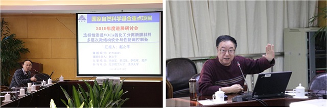 项目负责人米兰milan官方网站赵之平教授对与会各位专家表示热烈欢迎,衷心感谢各位研究骨干这一年来对项目进展所作出的努力。赵之平教授分别从项目总体研究方案、本年度进展、存在问题及解决方案和下一步工作计划四个方面对2019年度工作情况做了总体汇报,并介绍了团队这一年来开展的主要工作以及取得的阶段性成果。清华大学李继定教授将荷叶疏水机理应用于渗透汽化膜,研究OPS、POSS、MOFs等添加剂对混合基质膜性能的影响以及MOFs对噻吩、正庚烷的吸附和扩散行为。李欢军副教授团队和黎汉生副教授团队硕士研究生分别以“基于超疏水表面构筑渗透汽化膜制备及性能研究”“嵌段共聚物分离膜制备及甲醛废水处理”“双膜法分离甲醛水溶液”为题介绍了各自团队这一年来的工作进展情况。