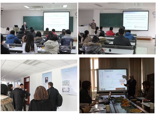 Camino教授分别就当前聚合物发展的新趋势——生物基材料和绿色化学的相关观点、面临的挑战、近年来新型纳米复合阻燃剂及其机理研究现状等进行了深入的讲解。Fina副教授详细介绍了聚合物不同燃烧行为的研究及纳米粒子的催化效应。讲座开阔了同学们的学术视野,对引领同学们进一步认识和理解阻燃材料研究开发中的问题具有积极意义,赢得了师生们的一致好评。在场的教师和同学们,就各自感兴趣的问题与教授进行了热烈的交流和探讨。