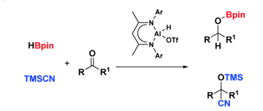 相比于过渡金属,主族元素有机化合物应用于催化有机合成反应一直是国际化学界的难题。杨智副教授课题组首次合成了具有特定不对称结构的铝氢化合物,并以其催化醛、酮、二氧化碳等小分子与HBpin的加成反应,显示出很高的催化活性。