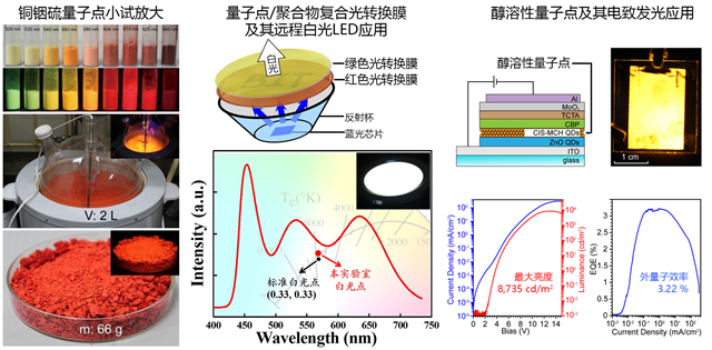 图1 CuInS2量子点的小试放大及其远程白光LED灯具和电致发光显示应用