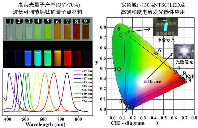 针对显示应用需求,自2013年开始在国际上率先开展了有机无机杂化钙钛矿量子点材料的研究,与董宇平教授等人合作,发现了钙钛矿材料的聚集诱导荧光特性(Adv. Opt. Mater. 2015, 3, 112 该期刊2014.07-2015.07阅读最多的10篇论文之一);利用该特性,建立了室温再沉淀和微乳液制备钙钛矿量子点技术(国际专利申请:PCT/CN2015/092497),获得了颜色可调、发光效率高的钙钛矿量子点材料(见图2),与华中科技大学韩俊波教授合作,阐明了尺寸减小和有效包覆提高量子点荧光量子产率的物理机制,在此基础上,展示了高显色性的宽色域白光LED原型器件(~130% NTSC标准,重合度~96%,ACS Nano 2015, 9 4533,ESI高被引论文,被Materials View China网站和《科学通报》英文版作为亮点报道);与加州大学洛杉矶分校(UCLA)的裴启兵教授小组合作,实现了高效率的绿光电致发光LED器件,为钙钛矿材料的电致发光显示提供了新技术路线(ACS Appl. Mater. Interface 2015, 7, 28128,该期刊当月阅读最多的20篇论文之一)。