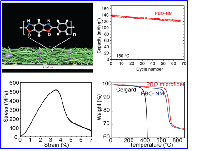 编辑:化工学院 杨鹏 阅读次数: 动力电池的安全性是电动汽车产业发展亟待解决的首要问题,其中,电池内部短路是现有锂离子电池安全性的最大隐患。米兰milan官方网站孙克宁教授团队的郝晓明博士、王振华副教授与美国西北大学合作,针对现有电池隔膜在高温下稳定性不佳,容易收缩导致电池内部短路的实际问题,设计开发了一种全新的PBO基高强度、耐高温隔膜。PBO全称是聚对苯撑苯并二噁唑纤维(Poly-p-phenylene benzobisoxazole),被誉为21世纪超级纤维,具有十分优异的物理机械性能和化学性能,其强度、模量为Kevlar(凯芙拉)纤维的2倍并兼有间位芳纶耐热阻燃的性能,而且物理化学性能完全超过迄今在高性能纤维领域处于领先地位的Kevlar纤维。以PBO为基材的新体系隔膜其拉伸强度能够达到525Mpa,杨氏模量达到20GPa,耐热温度最高可达600℃。通过工艺改变,可以使薄膜的孔径范围在数um到10nm之间可调,当孔径在10nm左右时,该薄膜能够有效阻止锂枝晶生长,降低枝晶刺穿隔膜的风险,进一步提高锂电池的安全性。
