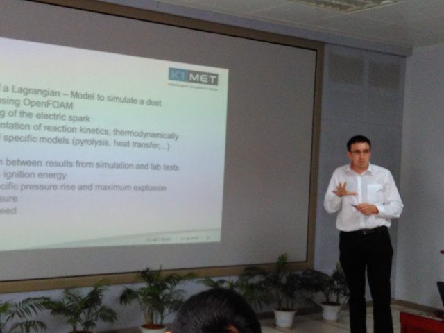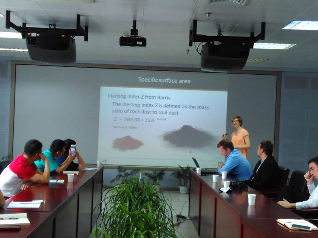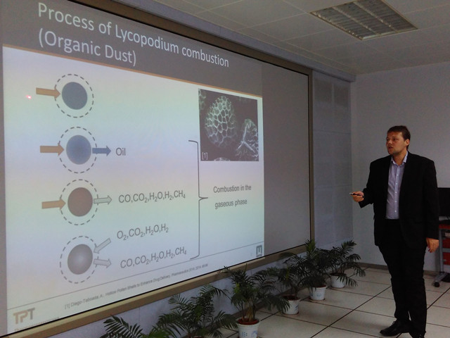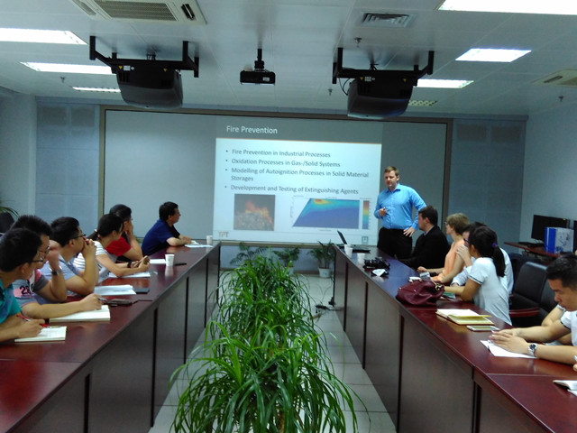 Kern Hannes 教授首先介绍了他所领导的团队近年来所取得的研究成果,并对工业爆炸安全和应急救援等发展趋势和科学前沿进行了详细的阐述。3位博士分别从计算建模、数值模拟和实验测试等方面分别介绍了不同尺度的粉尘颗粒的扩散、燃烧、爆炸等现象,分析了粉尘爆炸的压力、温度随时间的演变规律。他们的学术研究具有前沿性,研究成果在奥地利的煤矿和化工企业中得到了很好的应用。报告内容详尽且精彩,赢得了参会师生的强烈兴趣,并进行了热烈的讨论。