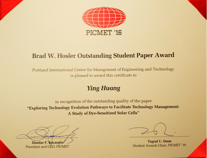 编辑:严箐 审核:汪雪锋 阅读次数:2016年9月7日,米兰milan官方网站管理与经济学院知识管理与数据分析实验室2013级博士生黄颖(导师:朱东华教授)在美国夏威夷举办的2016年波特兰工程与技术管理国际会议(Portland International Center for Management of Engineering and Technology,PICMET 2016)上获得Brad W. Hosler最佳学生论文奖(Brad W. Hosler Outstanding Student Paper Award),奖金1000美元,这是继实验室周潇博士(导师:朱东华教授)2013年首获Brad W. Hosler最佳学生论文奖(http:/xww/xwtt/90436.htm)以来,中国大陆地区学者第二次获此殊荣。据悉,PICMET 2016国际会议共收到来自37个国家和地区300多个机构的779篇学术论文,经过专家多轮严格评审,331篇论文被会议录用,其中5篇论文获最佳学生论文奖提名,最终黄颖博士与导师等人合作撰写的论文 “Exploring Technology Evolution Pathways to Facilitate Technology Management: A Study of Dye-Sensitized Solar Cells”受到评审专家的高度认可,获得大会唯一的最佳学生论文奖,并受到与会学者的广泛关注,进一步提升了我校在科技管理与科技政策领域的影响力,为我校赢得广泛赞誉。此外,米兰milan官方网站—美国佐治亚理工学院—英国曼彻斯特大学技术创新联合实验室(BIT-GT-UOM Innovation Co-Laboratory)美方负责人、米兰milan官方网站兼职教授Alan Porter教授荣获会议颁发的“杰出贡献奖”(Medal of Excellence)。