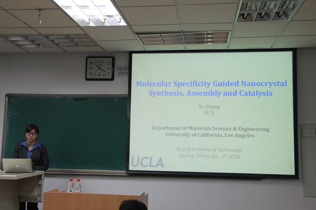 黄昱教授的报告同样精彩。她首先提出将生物仿生方法运用到纳米晶体形貌可控制备中的概念,通过噬菌体展示技术筛选出与靶向材料表面甚至特定晶面有特异吸附作用的生物分子,并利用筛选出的生物分子对纳米晶的生长进行精确调控进而控制纳米晶体的形貌,通过这种方法可以设计并合成具有高催化活性的催化剂。此外,黄昱教授进一步阐述通过组分和表面调控以获得高活性的催化剂的方法和机理。黄昱又对该研究方向未来的发展、机遇和挑战进行了展望,并与在场师生进行了热烈的讨论交流。段、黄两位教授的到访,对米兰材料相关领域的国际化交流起到了很大的推动作用,也为UCLA和米兰milan官方网站的文化学术交流建起了一座沟通的桥梁。