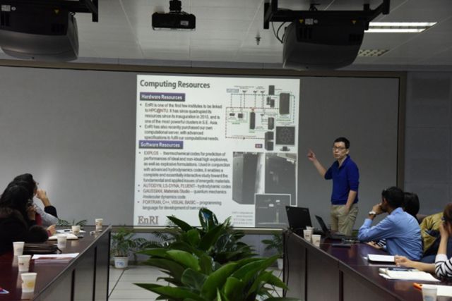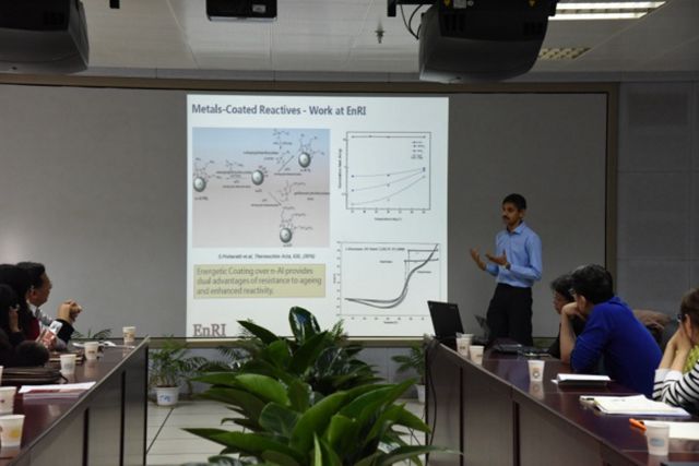 报告中,Hng Huey Hoon教授介绍了新加坡南洋理工大学含能材料研究所的基本情况、研究方向以及未来的发展规划,并明确提出希望能与实验室进行长期的学术交流与全面合作。Sreekumar Pisharath博士从含能材料的分子设计、制备与感度性能等多方面介绍了团队的工作成果,其中对于含铝炸药的包覆结构、纳米化CL-20炸药、高能粘合剂GAP的分子结构改进、高氮化合物的合成等进行了详细的阐述;Seng Yeow Sing博士从化学反应机理模型、爆炸物燃烧性能的预测、冲击作用过程中的热动力学模型等方面进行了讲解。报告内容引起了在场师生的强烈兴趣,并进行了深入的交流与讨论。