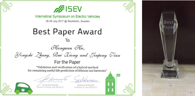 2017年7月26日至29日,在瑞典首都斯德哥尔摩举办的International Symposium on Electric Vehicles (ISEV2017) 国际学术会议中,我校机械与车辆学院电动车辆国家工程实验室何洪文教授课题组的论文“Validation and verification of a hybrid method for remaining useful life prediction of lithium-ion batteries”获得大会的Best Paper Award奖,并由大会主席Suleiman M Sharkh教授亲自颁奖。