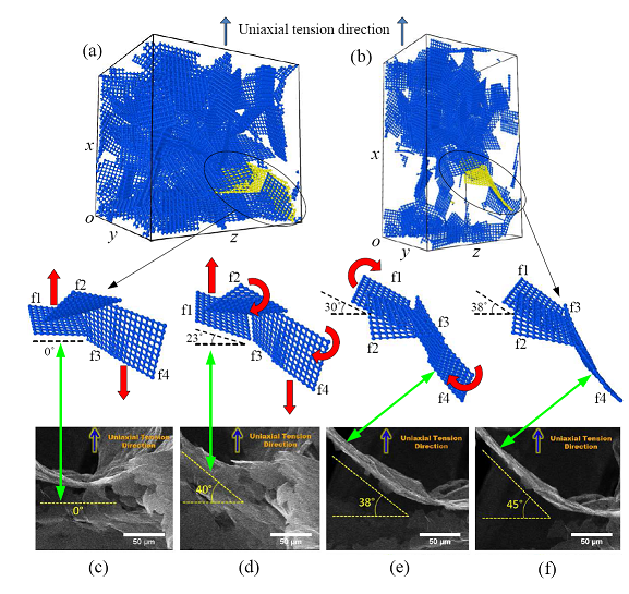 图:拉伸条件下石墨烯泡沫的介观结构演化过程,以及与Arvind教授原位拉伸试验SEM图的对比情况