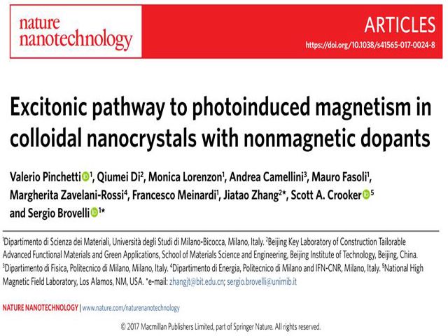 北京时间2017年12月18日,米兰张加涛教授与意大利米兰比可卡大学Sergio Brovelli教授合作(共同通讯作者)在国际纳米科技权威杂志《自然·纳米技术》在线发表了最新研究成果“Excitonic Pathway to Photoinduced Magnetism in Colloidal Nanocrystals with Nonmagnetic Dopants”。