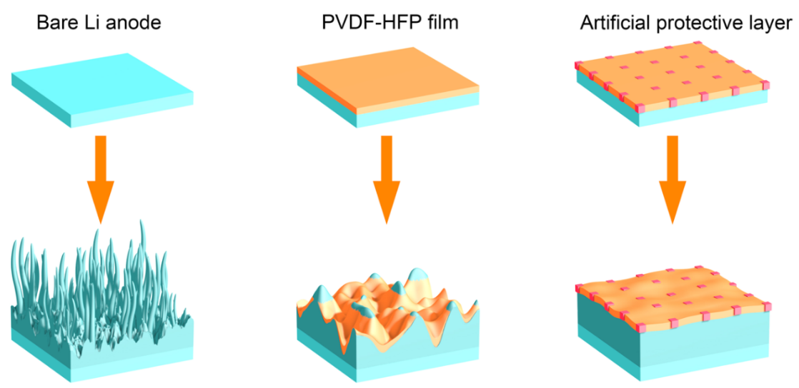 “刚柔相济”的复合膜对界面进行修饰后,可有效依附于金属锂表面,并抑制枝晶生长的示意图
