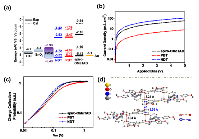 图2 (a)三种有机分子的能级分布和与PVSK的匹配程度;(b)“SCLC”法测试有机分子的空穴迁移率;(c)三种有机分子的电荷收集概率PC ;(d)NDT分子晶体结构中的 π-π堆积和 O-π堆积。