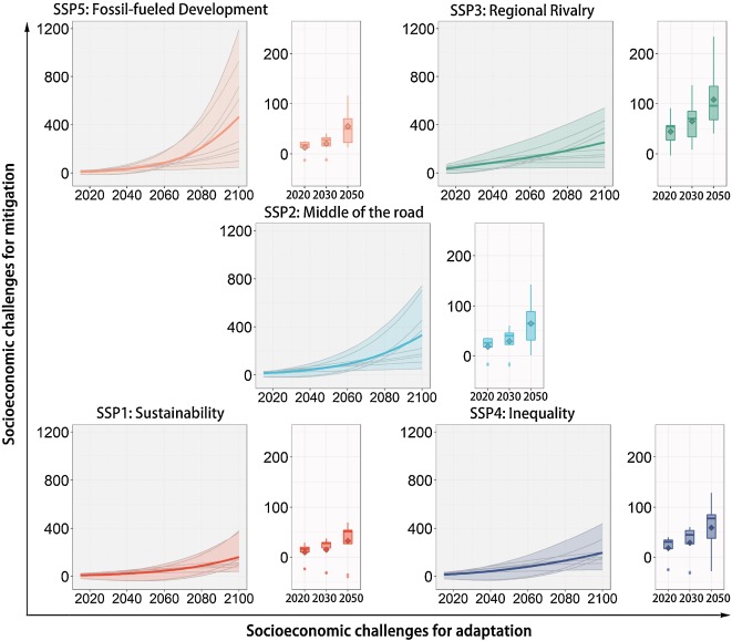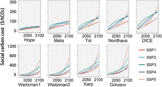 图2. SSP路径下社会碳成本的变化(灰色表示不同损失函数下的变化路径)