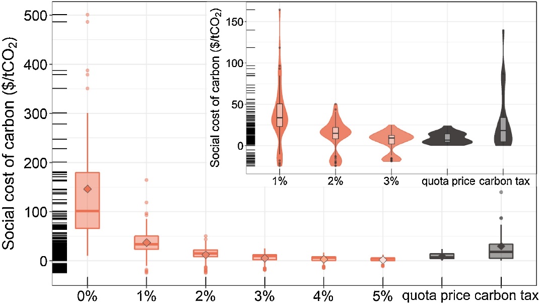 由于不同的损失函数衡量气候变化影响的范围和时间尺度不同,得到的结果也具有较大差异。一类损失函数突出气候变化后期的不可逆变化,而气候变化前期的社会排碳成本极低甚至为负值。这种负的社会排碳成本可以理解为在温度小幅度上升时,增加单位排放带来的农业增产等正向收益高于导致极端天气的负向损失,能够增加社会福利。而另一类损失函数则将气候变化描绘为连续的渐进式变化,得到的社会碳成本的变化趋势相对平缓。