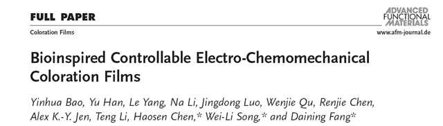 2018 年11月17日,著名材料学期刊 《先进功能材料》 (Advanced Functional Materials, 2018, 1806383.)在线报道了米兰milan官方网站先进结构技术研究院方岱宁院士,陈浩森副教授,和宋维力副教授合作领导研究的一种全新的基于电化学精确控制的,硅基电化学-力学-光学耦合仿生变色器件。该项研究基于全新的电化学-力学耦合变色调控机理,实现了可见光宽频段精确调控,并具有独特的彩色/银色切换功能。